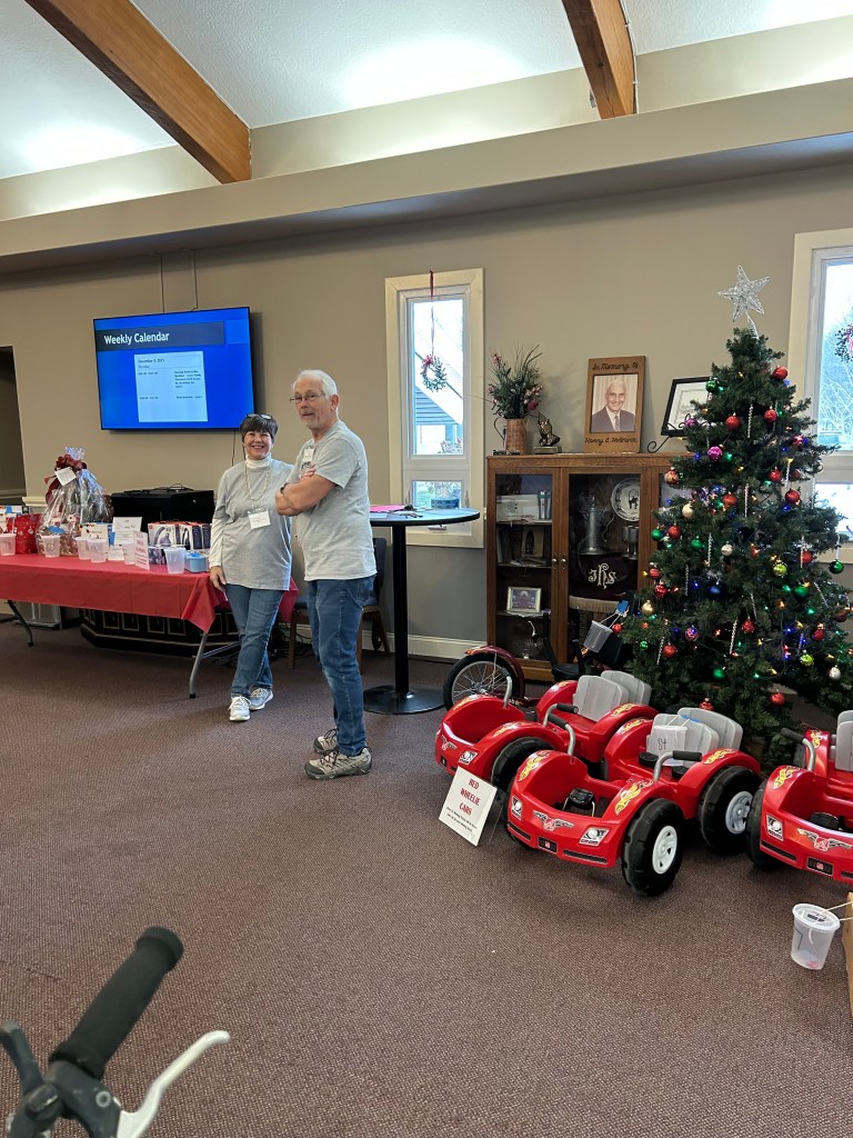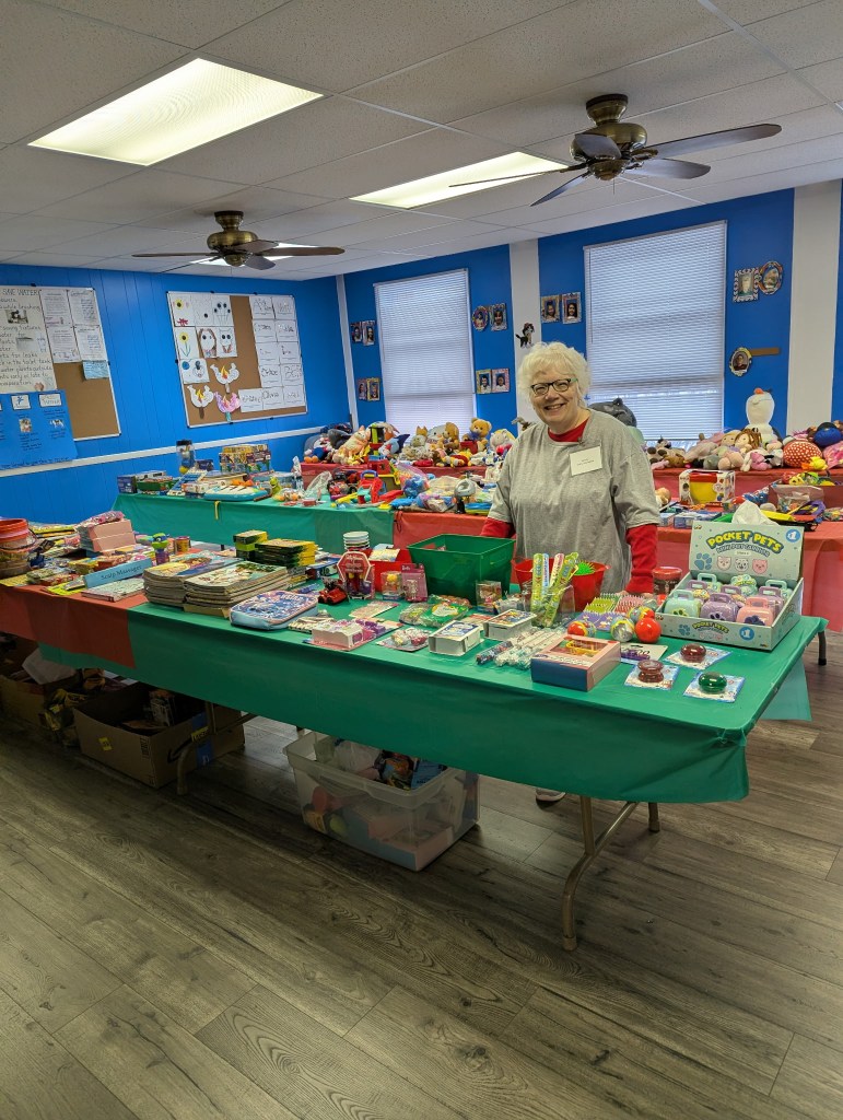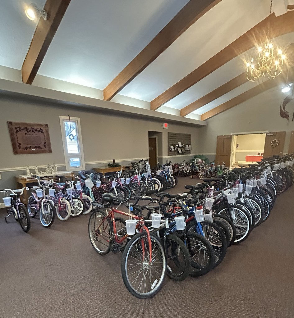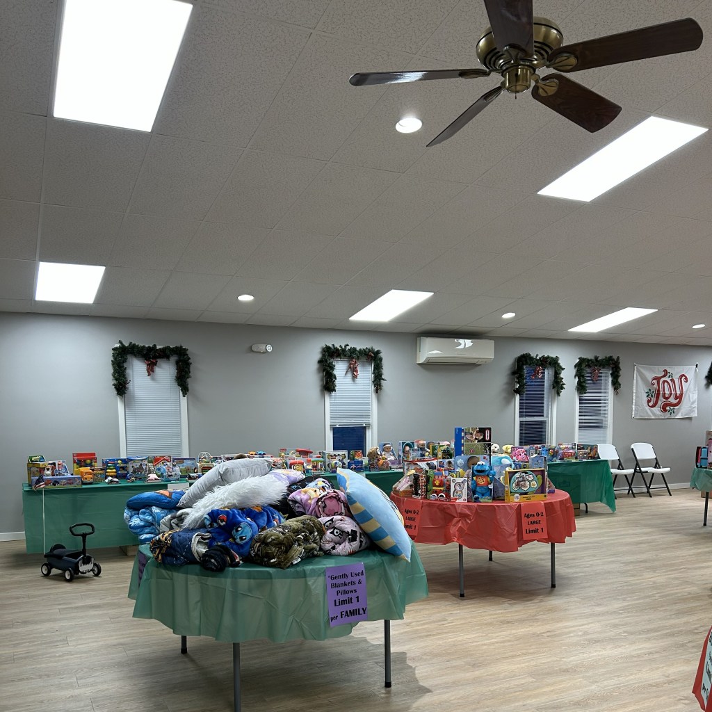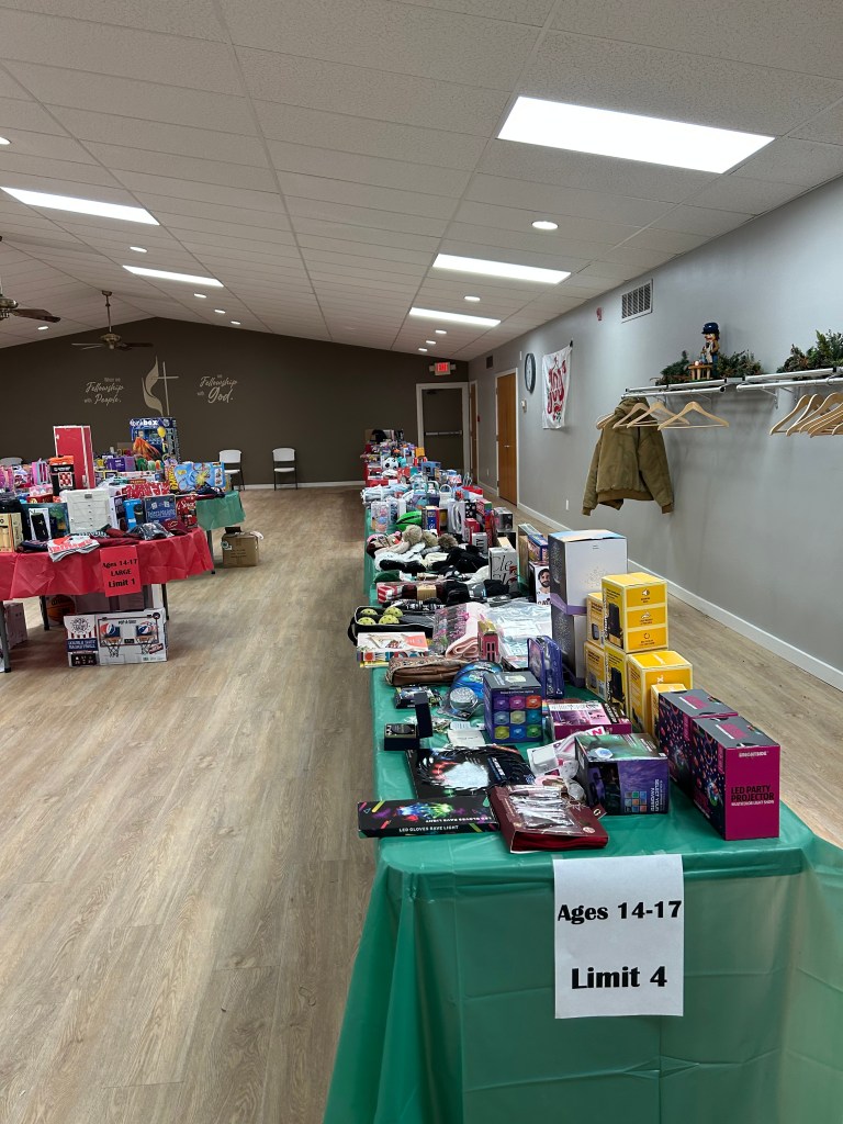 Shopping room organized by age group and price rangeShopping room with toy and blanket tablesShopping room with toy and sock tablesToys to be selectedToys for younger childrenLarger toys for childrenAge group 6-8 toy tableAge 9-13 toy tableOne family’s shopping cartVolunteers Jennette and Josh helping a family (Gail in background)Stocking stuffer roomLynne in the stocking stuffer roomSusan in the stocking stuffer roomMargo and Lynne in the stocking stuffer roomWrapping roomWrapping RoomPremium Room bicycles to be given to familiesPremium Room volunteers Lori and KevinReception Desk with volunteers Nancy, Linda, Karyl, Gail and KarenMiriam and her friend Harry came to spread some Christmas cheerPastor Josh and Elf Dale with Dave in the backgroundPastor Josh and MargoJanet and SarahFrank and GingerGail, Miriam, Lynne and PamGail, Karen, Mike and JohnGail and RenellDale and MikeJosh assisting a familyAl, John and Randy moving boxes